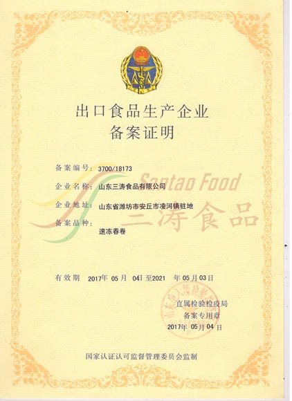 速凍春卷出口備案證明